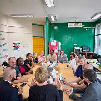 En passant par une porte communicante nous voici à quelques mètres de l’Ambassade dans le jardin de l'Ecole Française Internationale de Dacca (EFID). L’école a été créée en 1987, est en effet située dans le quartier diplomatique de Baridhara et construite sur le terrain de l’Ambassade de France. Elle accueille aujourd’hui environ 120 élèves avec des effectifs en constante évolution depuis 2020. Une évolution qui témoigne de la solidité du projet éducatif, de la qualité de l’enseignement dispensé et de la confiance croissante accordée par les familles francophones et internationales de Dacca. Après une visite des locaux, rencontre et échanges avec les différents conseils d’élèves élus (Conseil des délégués interclasses et éco-délégués), encadrés par les enseignants référents développement durable et l’enseignante responsable du Conseil des délégués. Présentation de leurs nombreux projets et restitution de leurs travaux : journée mondiale des droits de l'enfant, semaine des Lycées français du monde, Webradio et chaîne Youtube du Secondaire. Une école pleine de dynamisme ! Une grande attention est portée par l’équipe éducative sur l’éducation à la politesse des élèves et leur sens de l’accueil ! Bravo car les élèves ont été remarquables ! Nous avons enchaîné avec un Café-rencontre en compagnie des personnels élus et l’ensemble de l’équipe enseignante, les conditions de vie, de travail ont fait l’objet de questions-réponses. Si la vie n’est pas toujours des plus faciles au Bangladesh, l’école française reste un endroit privilégié pour les personnels qui témoignent des excellentes relations avec les élèves et de travail de manière générale. Bravo à cette belle équipe pour son travail !