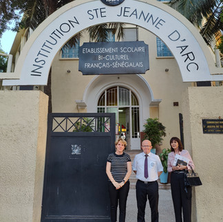 (...) J'ai ensuite poursuivi ma journée à l'Institution Sainte Jeanne-d'Arc, établissement qui fut conventionné avec l'AEFE et qui est partenaire depuis 2012. Cet établissement est spécifique à plusieurs égards : privé catholique, bi-culturel, deux filières scolaires (programme français et programme sénégalais, avec respectivement 1300 et 700 élèves) et programme post-bac avec 5 BTS / licences pro en programme sénégalais. Après un accueil et une visite avec le proviseur, Olivier Georges, nous avons eu une réunion avec son équipe de direction.